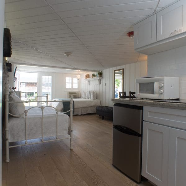 Garden level, 1 separate bedroom with 1 double bed, 2nd double bed + day bed in living room area, kitchenette, private bath (tub/shower combo).