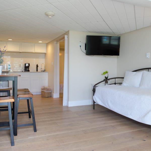Garden level, one bedroom with 1 queen bed, 2nd bedroom with 2 twin beds, day bed in living room, kitchenette, private bath (tub/shower combo).